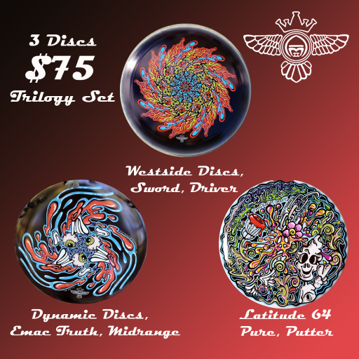 Buy the whole set of Trilogy Discs with Allen Moehr Art designs and Save $15.00. This set includes The "Nonagon Lunar Sun" design printed on Westside Disc's Sword (driver). "Tri Eye Fly" design printed on Dynamic Disc's Emac Truth (midrange). "Peace Paradigm Shift" design printed on Latitude 64's Pure (putter). These colorful designs will brighten up your bag and the premium plastic they are printed on will up your game. Thanks for checking it out have a great day.